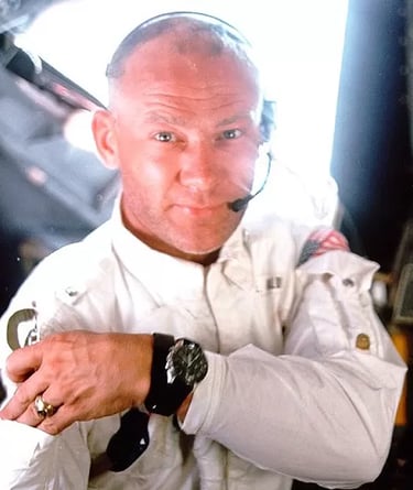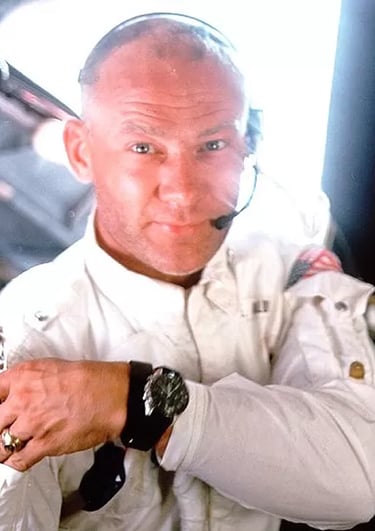 O astronauta americano Buzz Aldrin e seu Omega Speedmaster Professional, o único com selo de aprovação da Nasa.